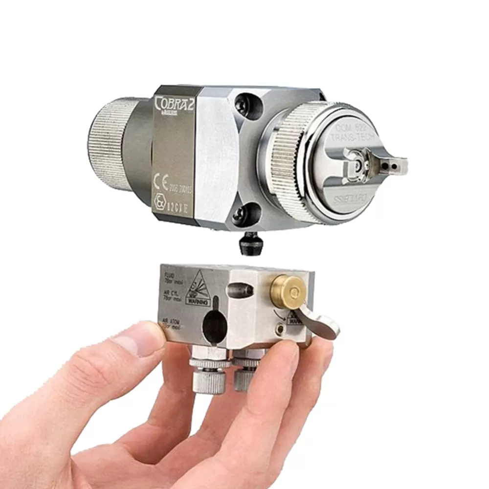 Devilbiss Cobra 2 Boya tabancası Basit bir itme mekanizması ile saniyeler içinde adaptörden ayrılabilir. Bu şekilde çok hızlı ve kolay bir tabanca değişimi yapılabilir. Üretimde kayıp süreyi büyük ölçüde azaltır.