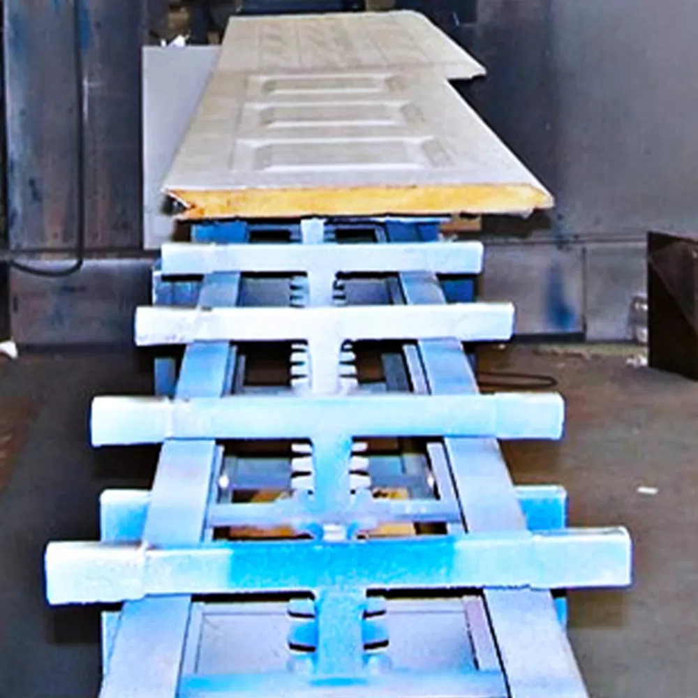Dış bakla, iç bakla ve burçtan oluşan konveyör zinciri çelik malzemeden üretilip sertleştirilir. Kopma mukavemeti 5.000 kg mertebesindedir. Konveyör rayı 65 mm NPU demiri ve 50x50 köşebentten oluşur ve konstrüksiyonla taşıyıcı ayaklar vasıtası ile yere sabitlenir. Taşıyıcı miller özel olarak imal edilmiş olup iki noktadan rulmanla yataklanmış ve bu şekilde hareket sırasında sürtünme en aza indirgenmiştir. Konveyör zincirinin gerginliğini sağlayan gergi istasyonu üzerinde bulunan tahrik merkezi, AC redüktör ile kayış kasnak mekanizmasından meydana gelir. Malzeme askılaması mil merkezlerinden yapılır.