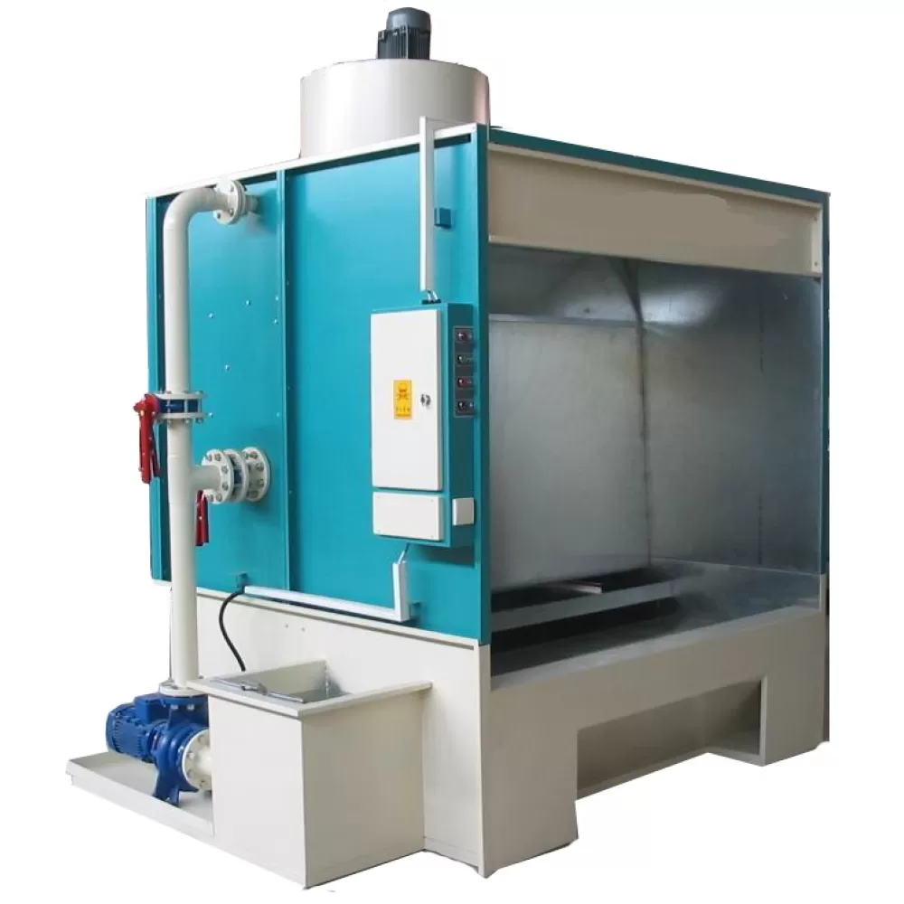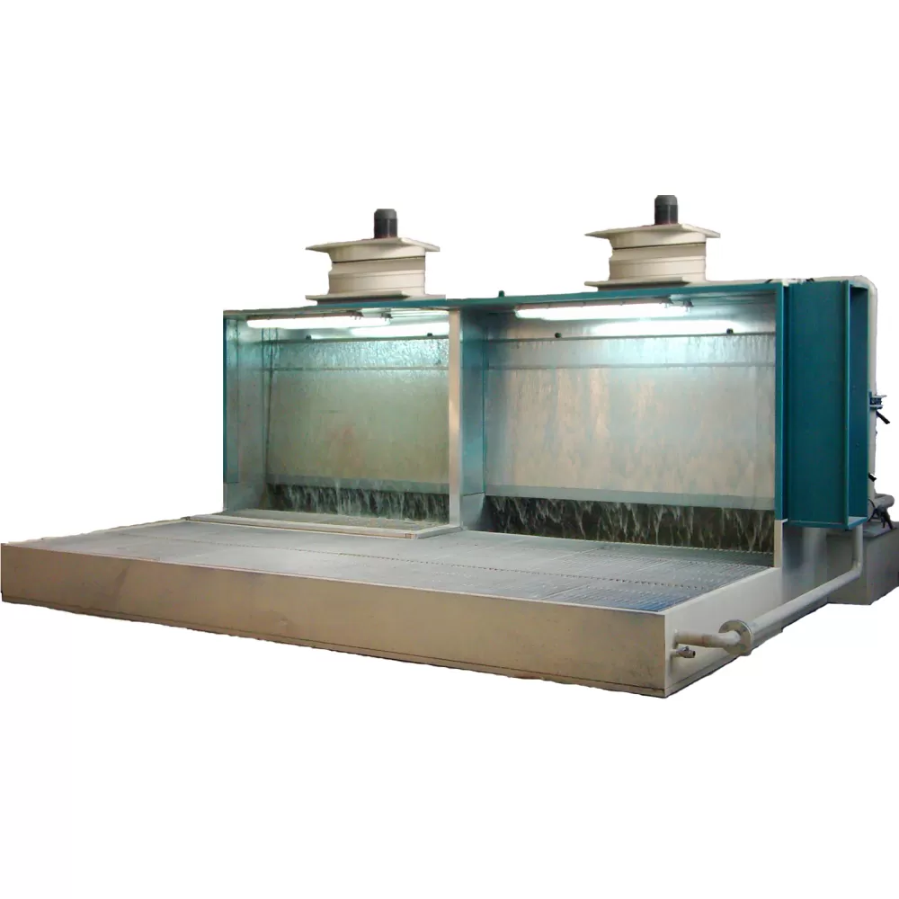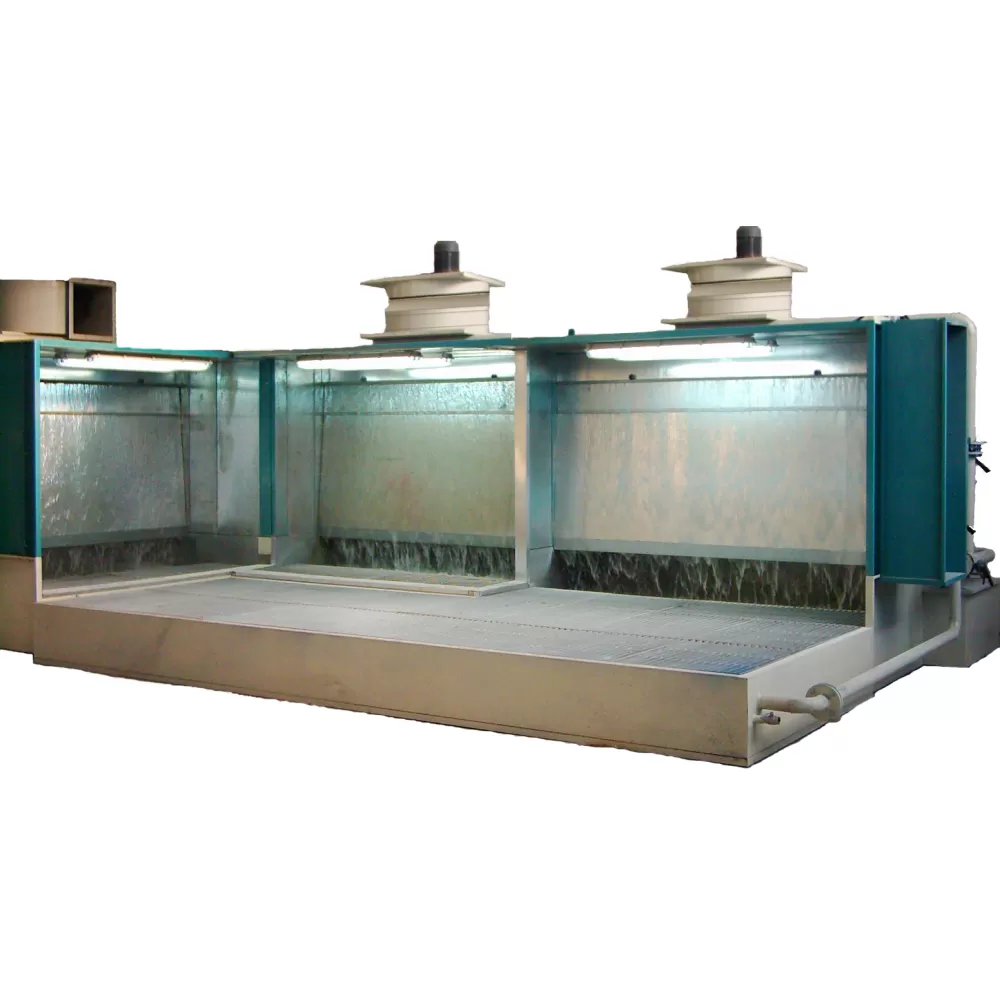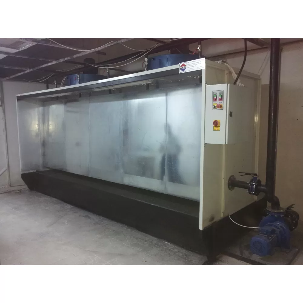 Yaş boya kabininin konstrüksiyonu galvaniz panellerden meydana gelmektedir. Boya kabininin dışı elektrostatik boya kaplıdır. Kabinin su perdesi, su havuzu ve filtrasyon tankı galvaniz sacdan imal edilir. Kabinde havanın yıkanması nozullar vasıtası ile yapılır. Su perdesinden kaçan boya partikülleri yıkama nozullarında yakalanır. Üst taşma kabı ve nozul basınç ayarı için ayrı ayrı vana mevcuttur. Pompa emiş öncesi iki kat su filtresi vardır. Emiş tankında taşma borusu, sistemin suyunu boşaltma vanası ve taze su giriş borusu vardır. Elektrik panosu kabin üzerinde olup, elektrik motorları termik rölelerle korunmaktadır. Aydınlatma etanj armatürle yapılmaktadır. Su perdeleme ve hava yıkama sistemi ile boya partikülleri en iyi şekilde tutulmaktadır.